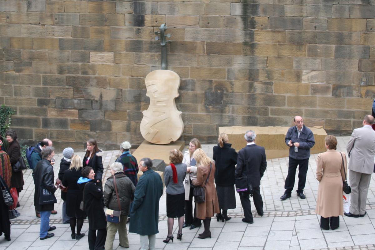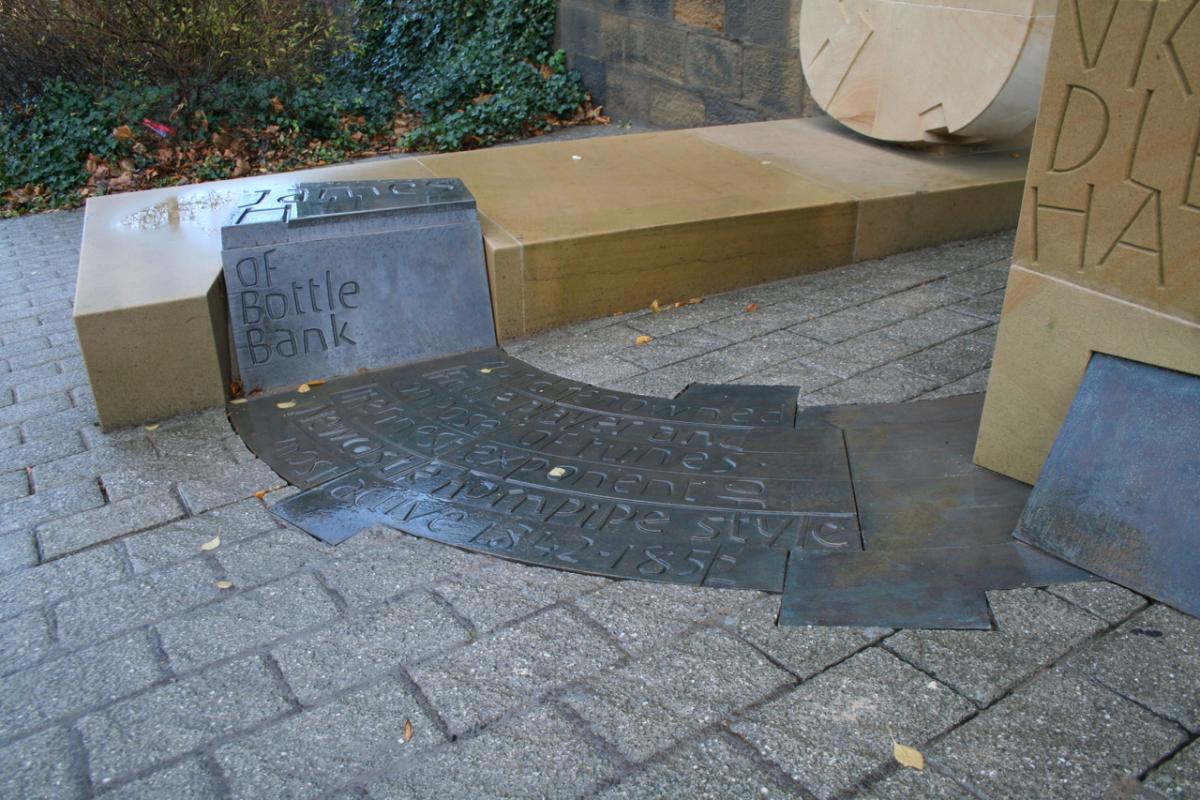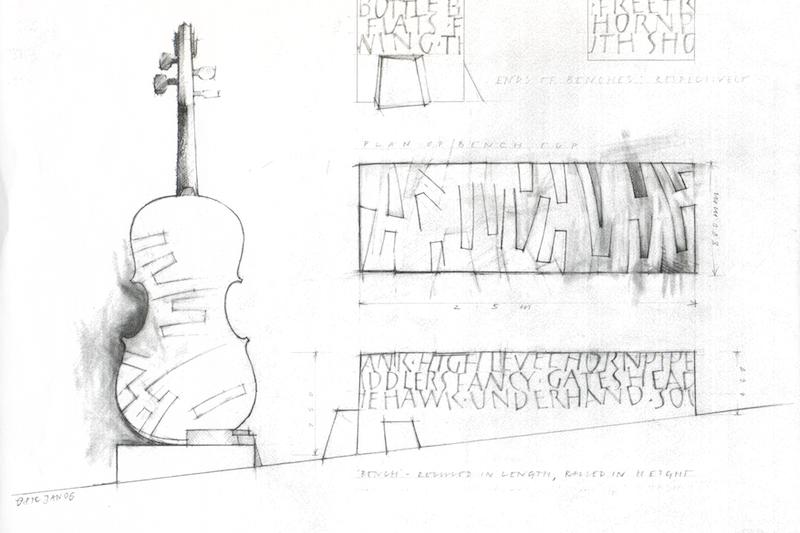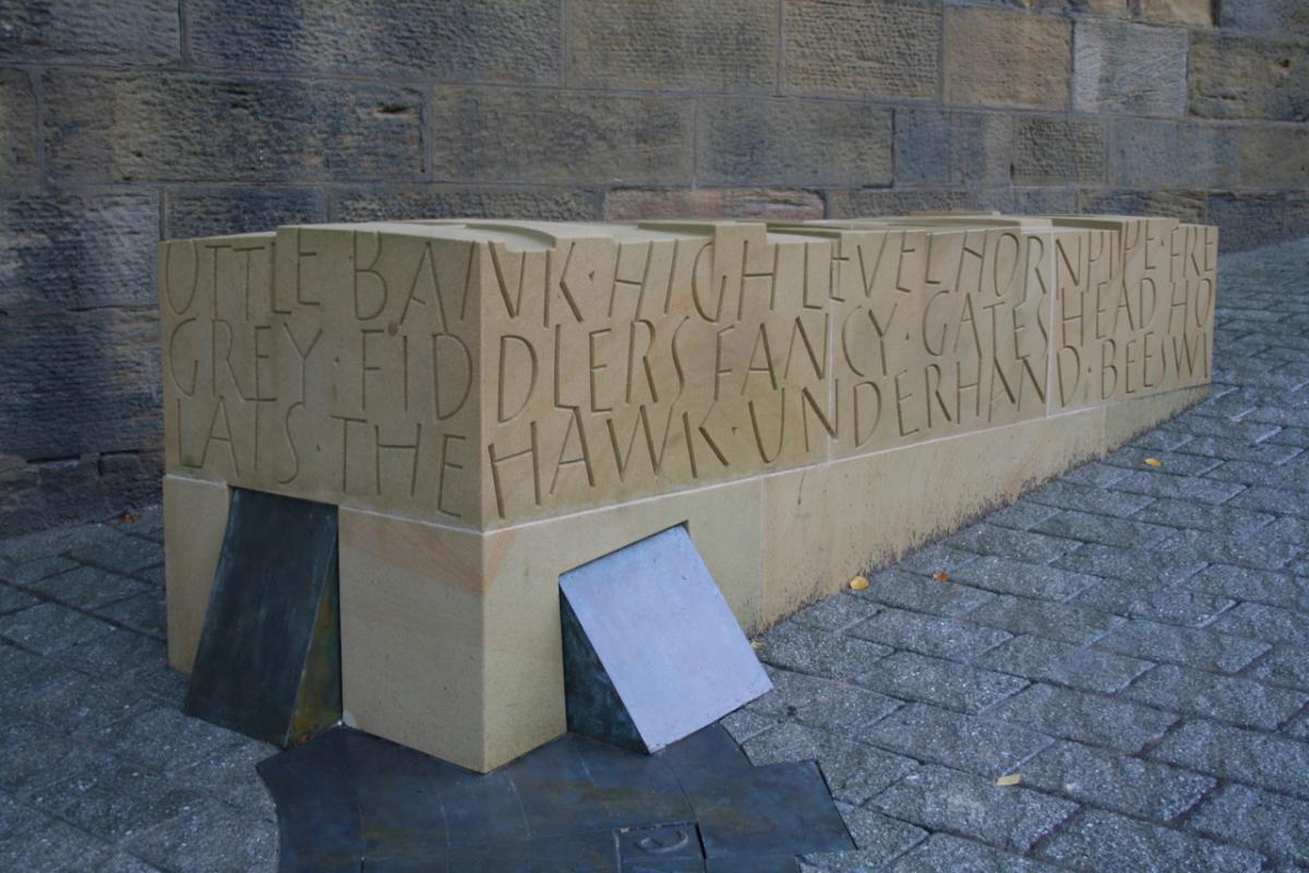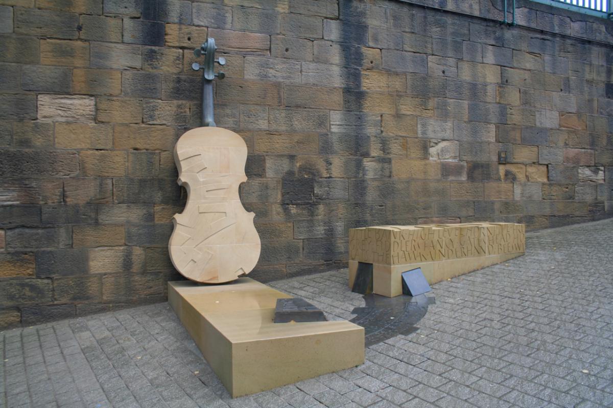 Sited at the abutment of the Tyne Bridge the work celebrates the life of the renowned 19 C musician / composer of popular music of his time and resident of Bottle Bank. The work won a Civic Trust Award in 2009 and has become a place of pilgrimage for Hill aficionados worldwide. It incorporates a bench which is appropriately sited to offer a resting place before the steep descent to the quayside. The fiddle is a free standing and self supporting structure, it makes no contact with the abutment which is a scheduled ancient monument.